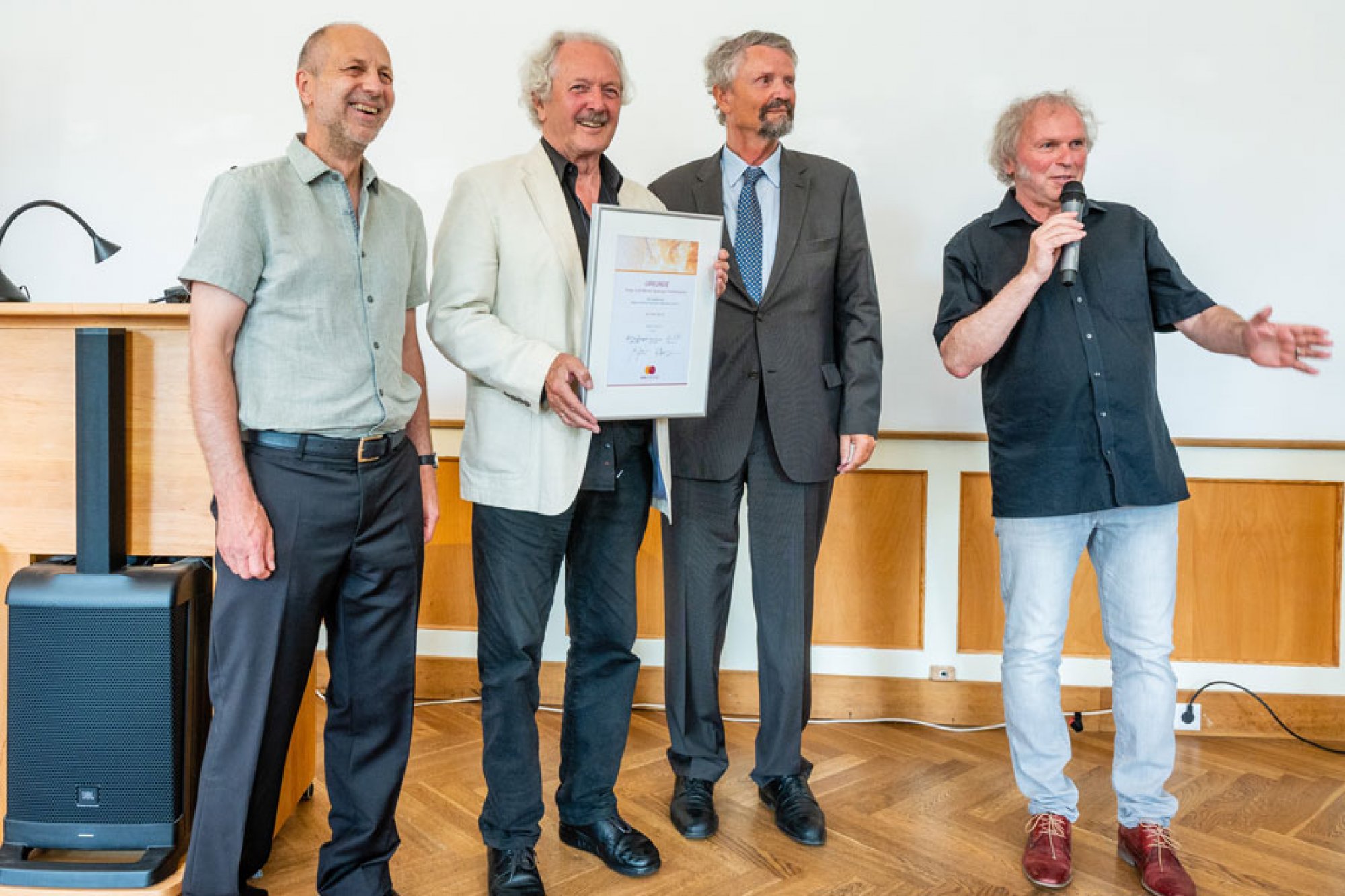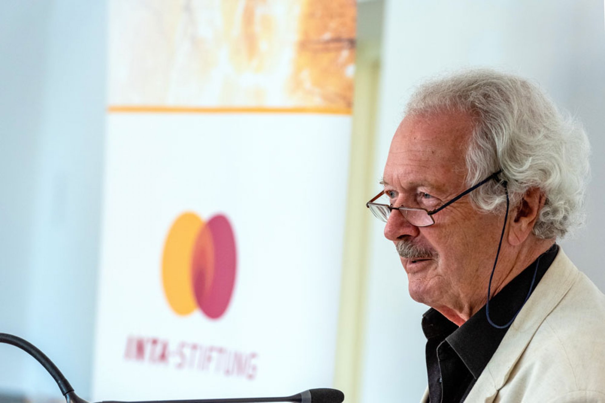 Ursula Sladek, Mitbegründerin der Elektrizitätswerke Schönau, Gernot Erler, Staatsminister a. D., die beiden INTA-Stiftungsräte Uwe Baumann und Peter Herrmann und die Friedenspreisstifterin Helga Sprenger.